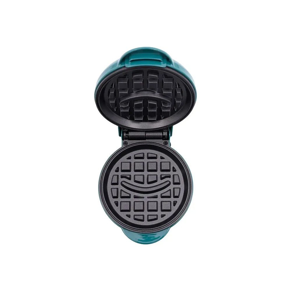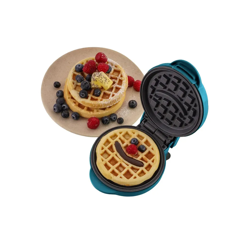 Mini waflera compacta y ligera en color turquesa, ideal para preparar waffles deliciosos de forma rápida y sencilla. Con placa antiadherente, luz indicadora de temperatura y exterior que no se calienta. Fácil de usar, limpiar y almacenar para desayunos, meriendas o snacks en casa. Perfecta para espacios pequeños.